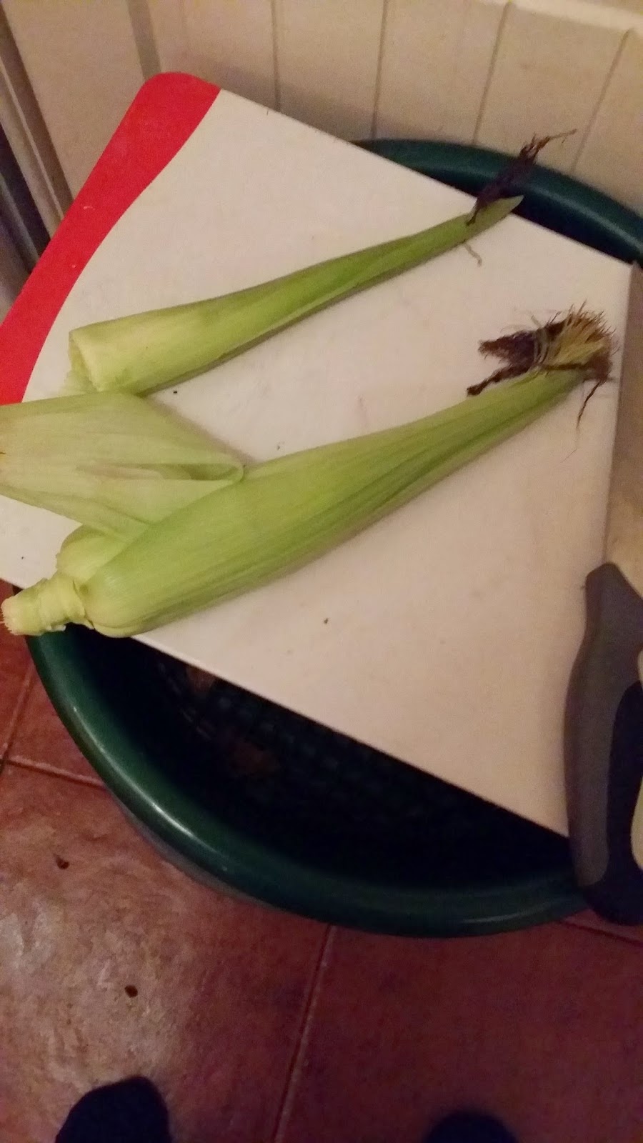 Corn is viable to eat when the top tassels turn a chocolate brown, but it's impossible to tell from the outside if you've got anything or not as the actual eaty bit is concealed inside the green bits. So I harvested a few likely looking husks and carried them into my wife, who was declared expert on the grounds that I didn't know what I was doing and she didn't say "Not it" quickly enough. Plus, she's admitted to liking shop-bought corn before - that's plenty expert enough for me and frankly she should know better by now.